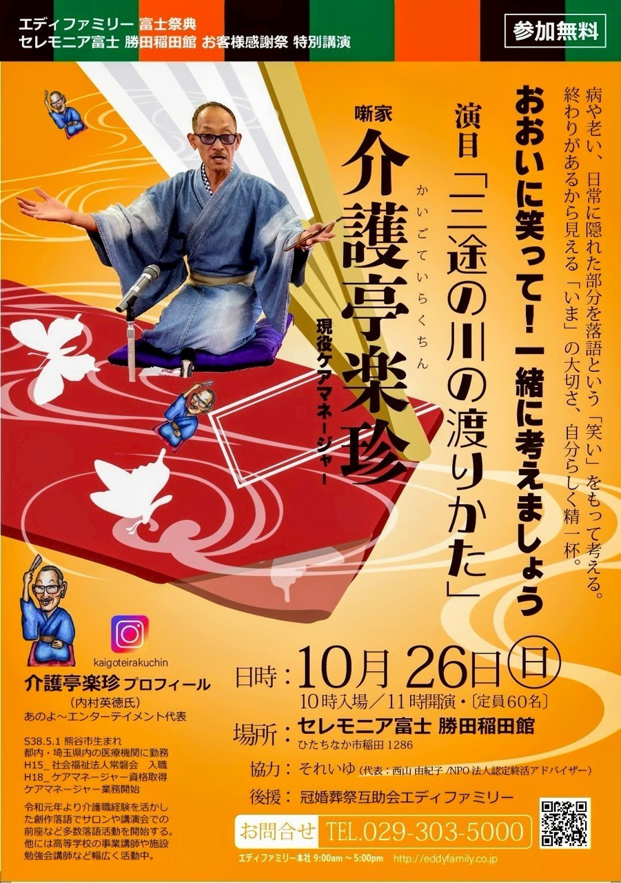 介護亭楽珍さんは普段は施設のケアマネジャーをされていますが、全国から落語の依頼があり、お忙しい方です。是非、この機会に足を運んでご覧いただけたら嬉しいです。